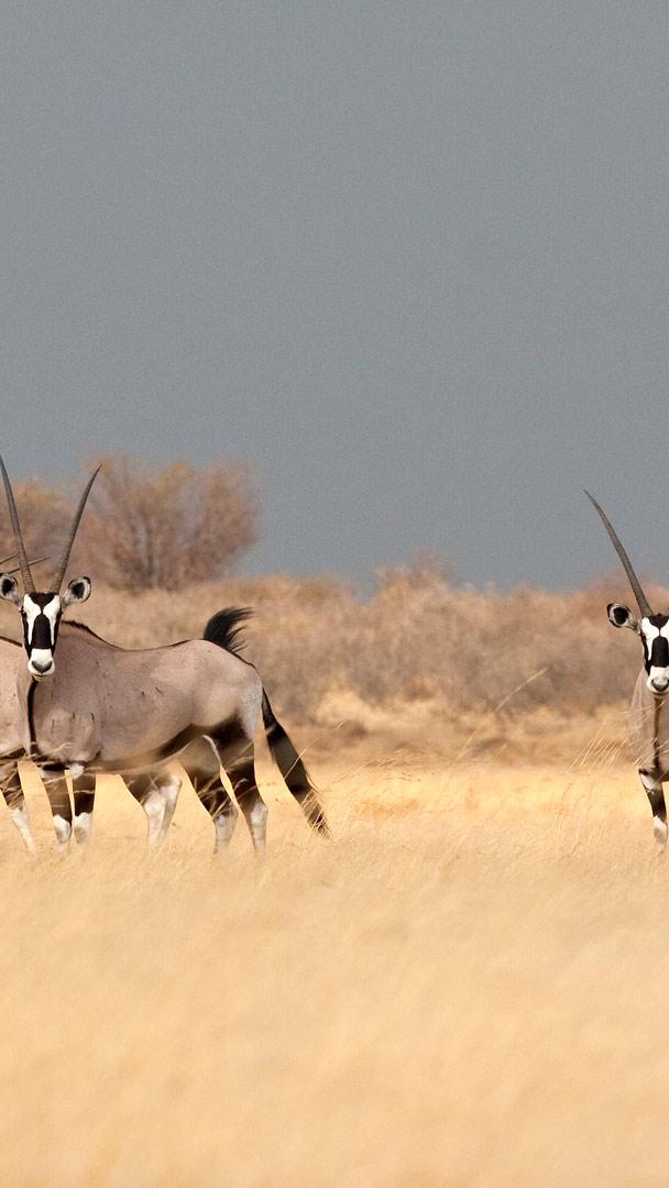 2024-06-11 竖起犄角,昂首挺胸!今天的图片展示的是一群南非剑羚,这是一种大型羚羊,统治着非洲西南部广袤的热带稀树草原。它们原产于博茨瓦纳、纳米比亚、南非和津巴布韦的部分干旱地区,主要生活在卡拉哈里沙漠和纳米布沙漠。它们能够在极度干旱的条件下生存,可以数周不喝水,仅从吃的食物中获取水分。此外,南非剑羚是草原上的奔跑健将,最高时速可达每小时37英里。它们的显著特征是头上那对又长又直的犄角,尽管雌性剑羚和雄性剑羚都拥有这种强大的防御武器,但雌性的角往往更长更光滑,而雄性的角则更粗、基部更宽。如果有天您去到了卡拉哈里的沙地平原,一定要留意这些沙漠中的珍宝。