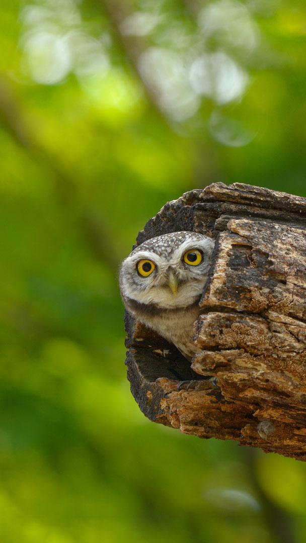 2024-08-08 如果比赛对视,你觉得你能赢过这种鸟儿吗?横斑腹小鸮有着灰褐色的脸和锐利的黄色眼睛,主要在夜间活动。白天,横斑腹小鸮会休息,当其它小鸟发现它们时,会围攻它们。一旦受到骚扰,横斑腹小鸮往往会瞪着入侵者,晃动脑袋,并发出响亮的尖叫声,这种声音有时也被描述为笑声或咯咯声。<br>横斑腹小鸮身高约8英寸,羽毛上有斑点,在伊朗至越南地区都能找到它们身影,而今天的图片中的横斑腹小鸮是在泰国曼谷拍摄的。它们主要以昆虫和小型哺乳动物为食,例如蝙蝠、老鼠等,经常将食物储存起来,等到食物稀缺时再吃。横斑腹小鸮是一种适应力很强的物种,在半沙漠、岩石地区、森林、农田和城市地区等环境中都可以生存发展。虽然它们并不是濒危物种,但是其种群数量在过去四年中有所下降,或许是栖息地丧失和城市化加剧所致。