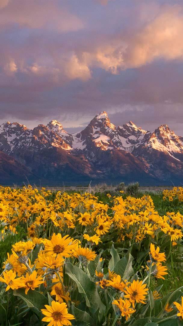 2022-06-17 这些箭叶脂根菊,通常被称为俄勒冈向日葵,在高耸的山脉下面的山谷中可以欣赏到大提顿山脉的壮丽景色。该地区恶劣的天气意味着只有最顽强的野花才能生存,而箭叶脂根菊正好符合这一要求。这些植物耐旱、耐寒、抗踩踏,甚至耐火,主根在茎叶被烧后还能再生叶子和花朵。<br>大提顿国家公园距离黄石国家公园仅16千米,它和周围的国家森林构成了近72843平方千米的大黄石生态系统,这是世界上最大的完整的中纬度温带生态系统之一。大提顿国家公园适合每一个户外爱好者,是登山、徒步、钓鱼和其他娱乐活动的热门目的地,它有1000多个免下车露营地和超300千米的徒步旅行路线,可以进入偏远的露营区。大提顿国家公园是美国十大最受欢迎的公园之一。