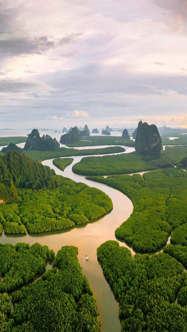 2022-06-29 只有在热带地区,森林才会在海水中生长。以泰国南部攀牙湾的这片红树林为例,它是该国最大、保存最完好的红树林之一。红树林适宜在沿海沼泽和湿地中生长,它们可以过滤海水并抵御强烈的沿海风暴。几乎所有的红树林都只存在于热带地区。它们是海岸线的保护者,充当着风暴和洪水的缓冲区。<br>今天,以及每年的6月29日,我们都会和联合国一起纪念国际热带日。这是聚焦世界热带地区独特美景及其所面临的挑战的时刻。热带被大致定义为北回归线和南回归线之间的赤道周围区域。据联合国估计,到2050年,热带地区将成为地球上大部分人类和世界三分之二儿童的家园。但它同时也是世界上最贫穷的地区,也最容易受到全球变暖的影响。<br>安达曼海的攀牙湾是泰国最为珍贵、游客最多的景点之一。其朝南的海湾面积约为388平方千米,包含着许多石灰岩小岛、塔式岩溶、悬崖、洞穴和泻湖。它的入口是普吉岛的旅游圣地。皇家法令1981年创建的奥攀牙国家公园保护了海湾的大部分。公园内最著名的地标可能是“钉子岛”,这是一块底部比顶部窄的圆柱形岩石。它曾出现在1974年的詹姆斯·邦德的电影《007之金枪人》中,此后这里被称为“詹姆斯·邦德岛”。然而,攀牙湾真正的明星是红树林,坚韧、奇妙、美丽的红树林也正是其所处热带地区的恰当比喻。
