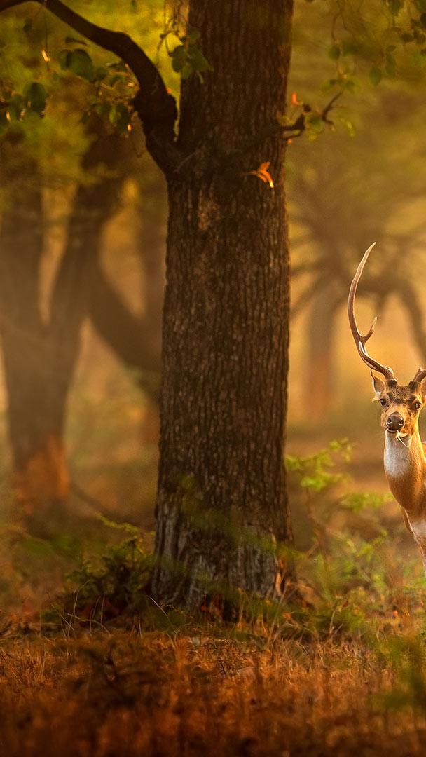 2022-06-10 这里是滕波尔国家公园,印度北部最大也最著名的国家公园之一。它位于拉贾斯坦邦东南部的瑟瓦伊马托布尔区,距斋浦尔约130公里。这个国家公园曾是斋浦尔王公们的著名狩猎场之一,而如今,它是著名的野生动物旅游景点,吸引着许多野生动物摄影师和爱好者。<br>滕波尔国家公园是许多哺乳动物、爬行动物和鸟类的家园。它最出名的是皇家孟加拉虎,同时还有许多豹子、懒熊、多个品种的鹿(比如图上的斑鹿)、沼泽鳄、椰子狸、豺、耳廓狐、蛇雕、水禽等。滕波尔国家公园共有40种哺乳动物,35种爬行动物,以及321种鸟类。<br>斑鹿是印度森林中最常见的鹿种。斑鹿的寿命约为20至30年,高约0.89米,重约85公斤。斑鹿的金黄的毛色上点缀着白色斑点,腹部为白色。从审美上说,斑鹿也许是所有丛林野生有蹄类动物中,最优雅、最美丽的。是的,这点毫无疑问。
