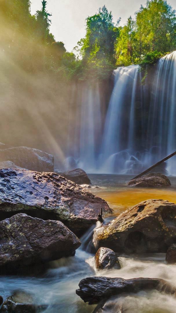 2016-09-06 茂林修竹夹峙的开阔山谷,水帘似的大瀑布沿石壁倾泻而下,气势宏大犹如万马奔腾。这座美丽的瀑布就是位于柬埔寨的荔枝山瀑布。倾泻而下的水流像下台阶一般跨过平台砰然跌落在峭壁下的水池中,形成宽达100米的瀑布,声音响亮,水花四溅,十分壮观。