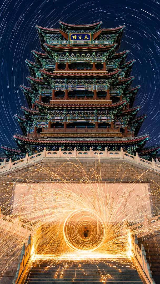 2016-10-01 在永定河畔,有着一座新建不久的城楼——永定楼。这座仿造湖北武汉黄鹤楼而建的城楼,在夜幕下光彩夺目,点缀着永定河畔。也让北京的西部,增添了一丝旧时古城的味道。静静地伫立在河畔,永定楼仿佛守护着这条河,也守护着北京城。