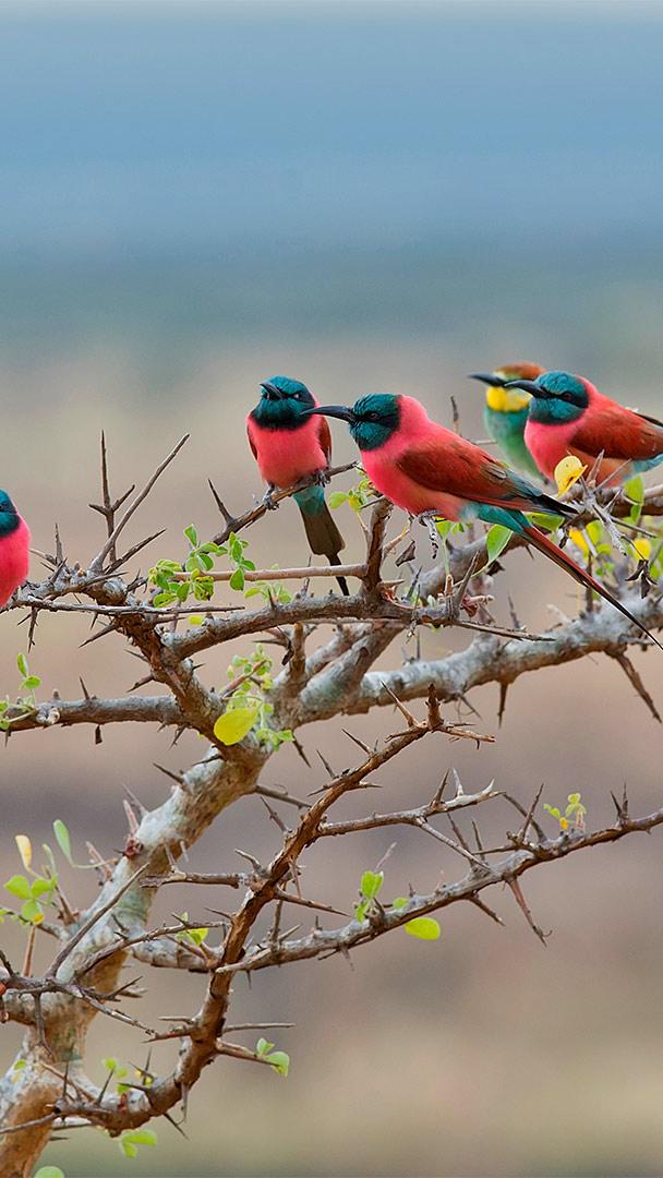 姆科马齐国家公园的北部胭脂红食蜂鸟和欧洲食蜂鸟,坦桑尼亚