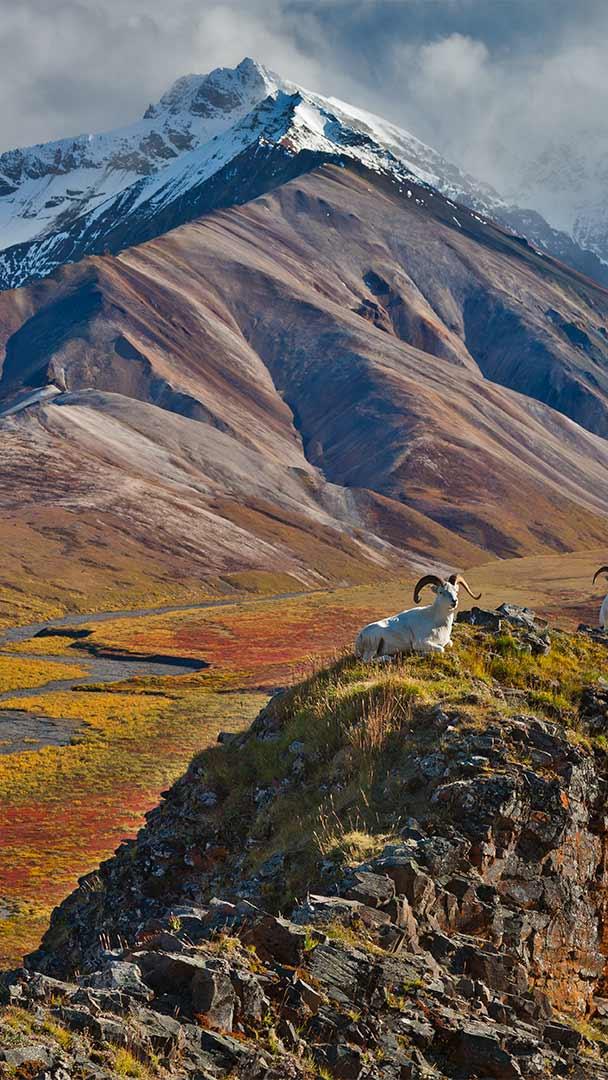 迪纳利国家公园里的白大角羊,阿拉斯加