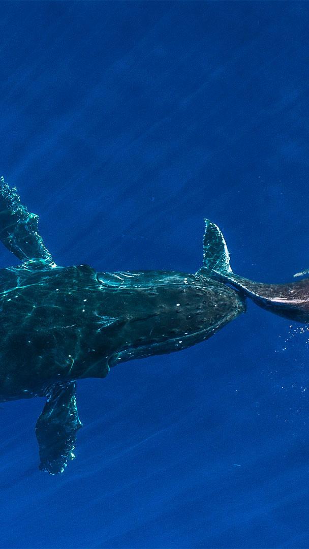座头鲸妈妈将她熟睡的幼鲸推到水面,夏威夷毛伊岛