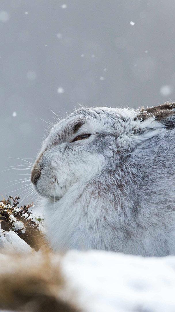 一只在暴风雪中蜷缩着的雪兔,英国苏格兰凯恩戈姆斯山脉