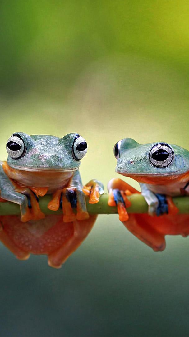 四只爪哇树蛙趴在树茎上,印度尼西亚