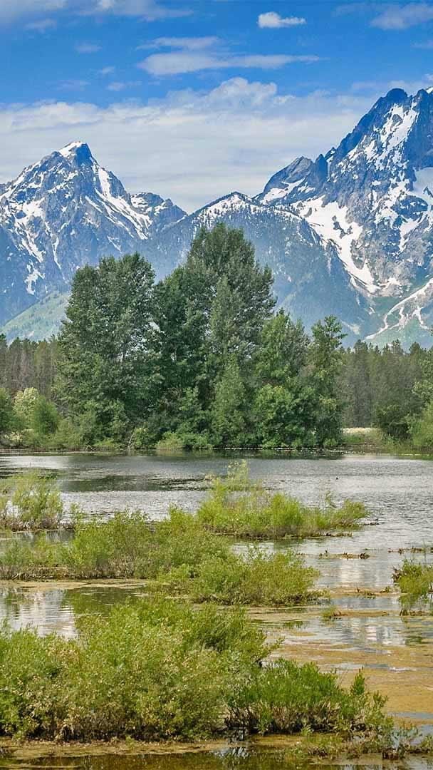 驼鹿穿过莫兰山下的池塘,怀俄明州大提顿国家公园