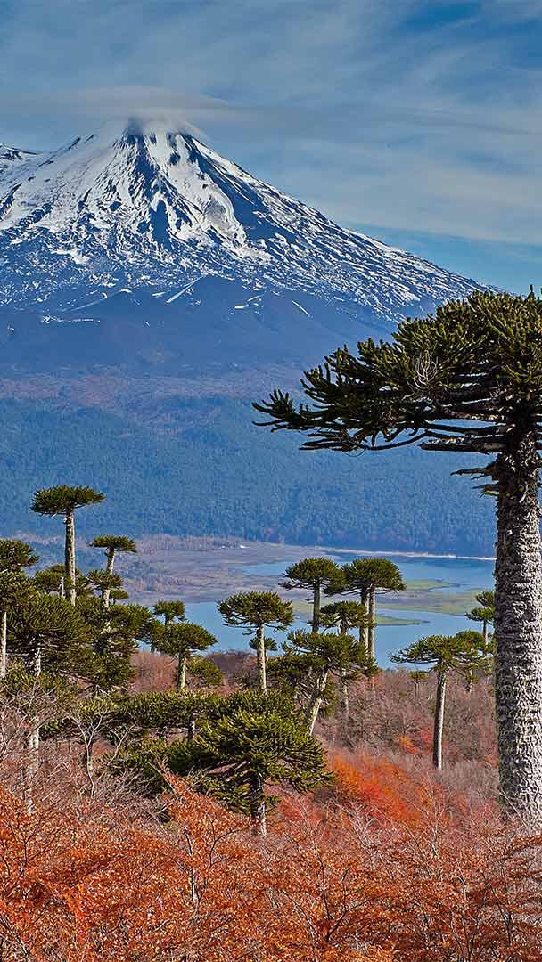 亚伊马火山与前景中的智利南洋杉,智利孔吉利奥国家公园
