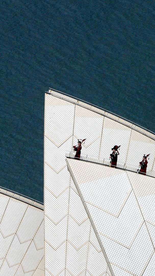 皇家高地燧发枪团在悉尼歌剧院屋顶演奏风笛