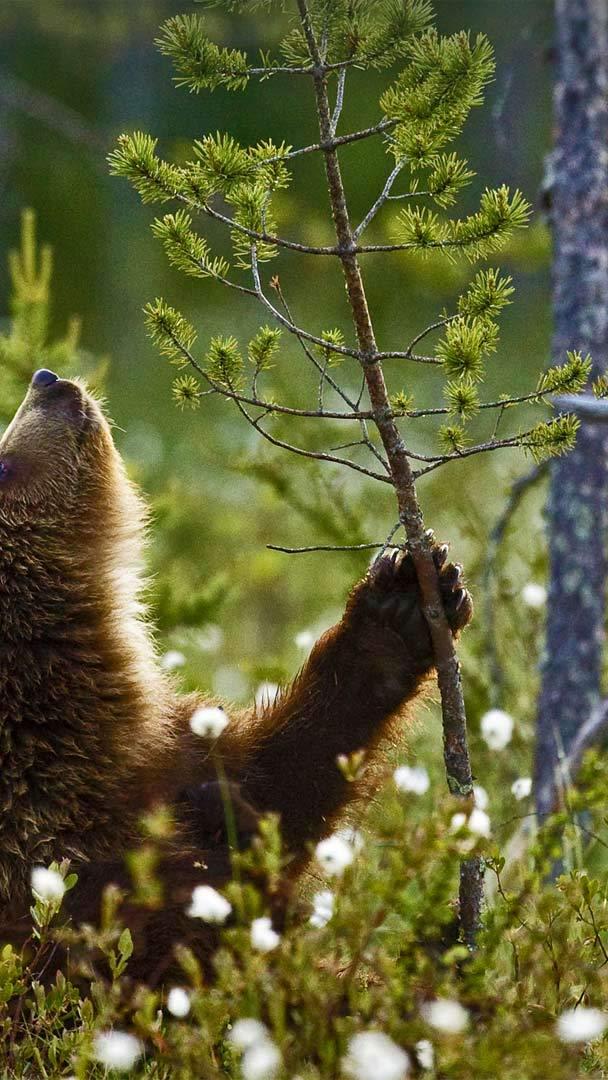 北方针叶林中的欧洲棕熊幼崽,芬兰