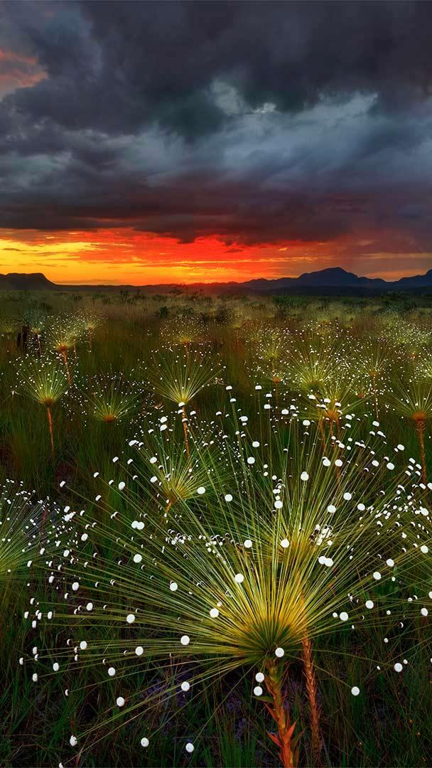 日落时的Paepalanthus花,巴西Chapada dos Veadeiros国家公园