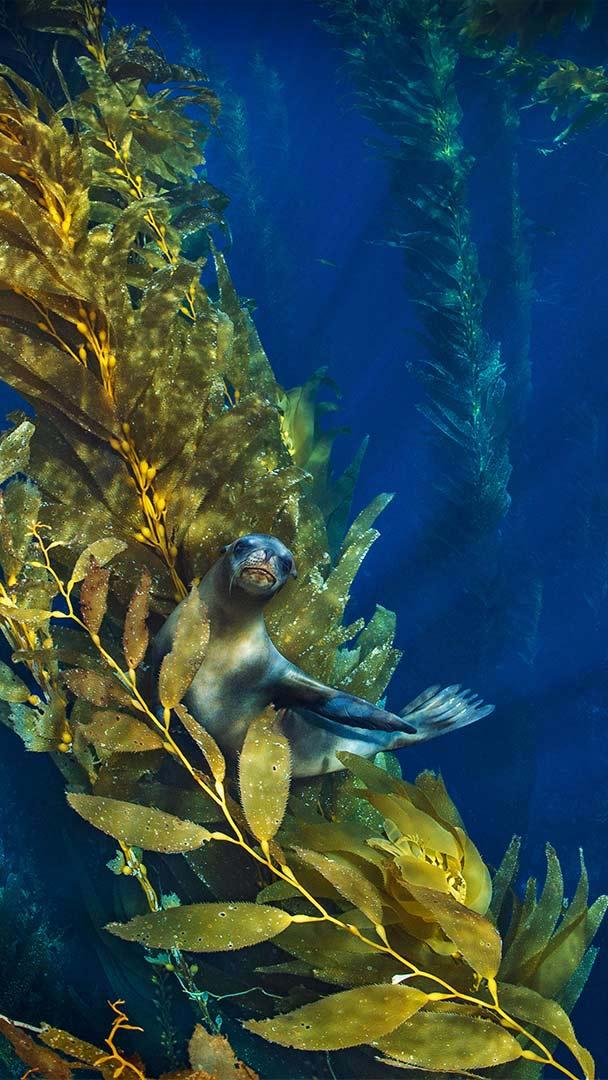 海峡群岛附近巨藻林中的加利福尼亚海狮