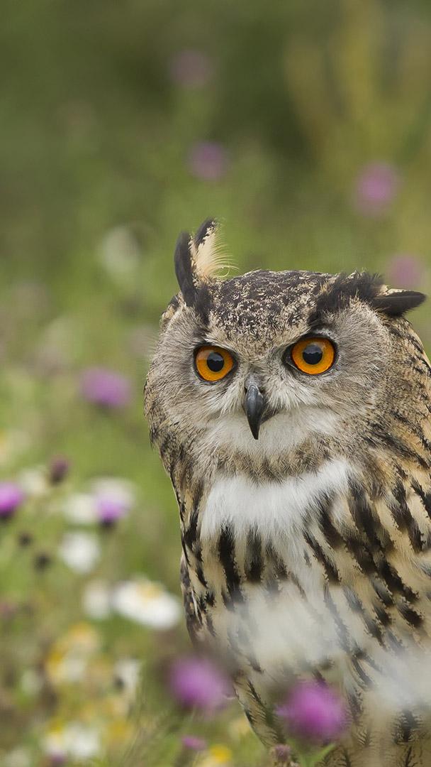 野花草甸上的一只欧亚雕鸮,德国莱茵兰-普法尔茨