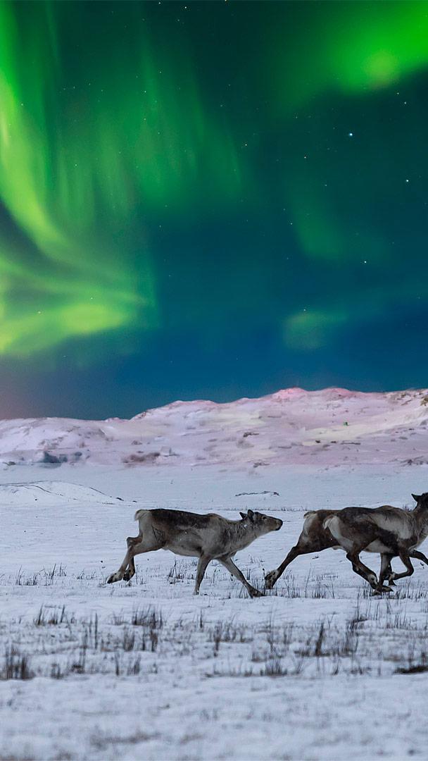 挪威苔原上的北极光和野生驯鹿