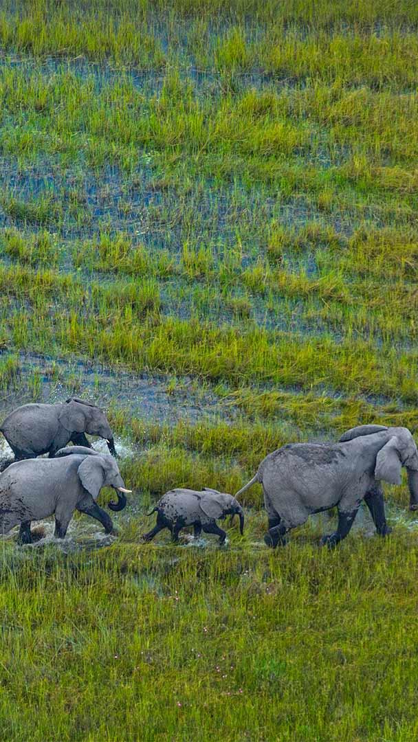 奥卡万戈三角洲上的非洲草原象群,博茨瓦纳