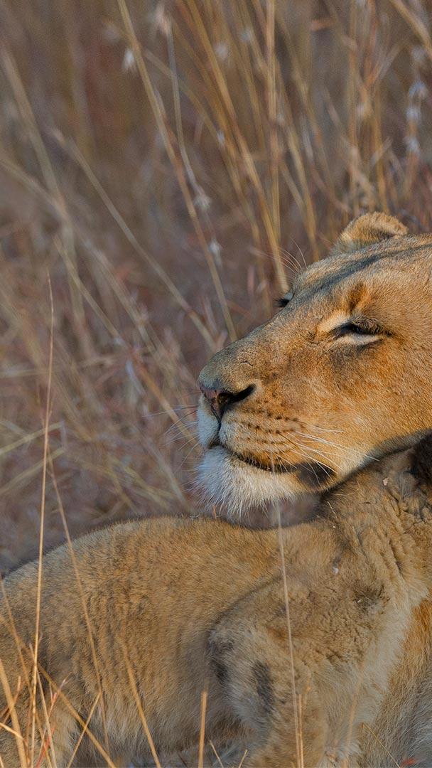 草丛中的母狮和它的幼崽,南非