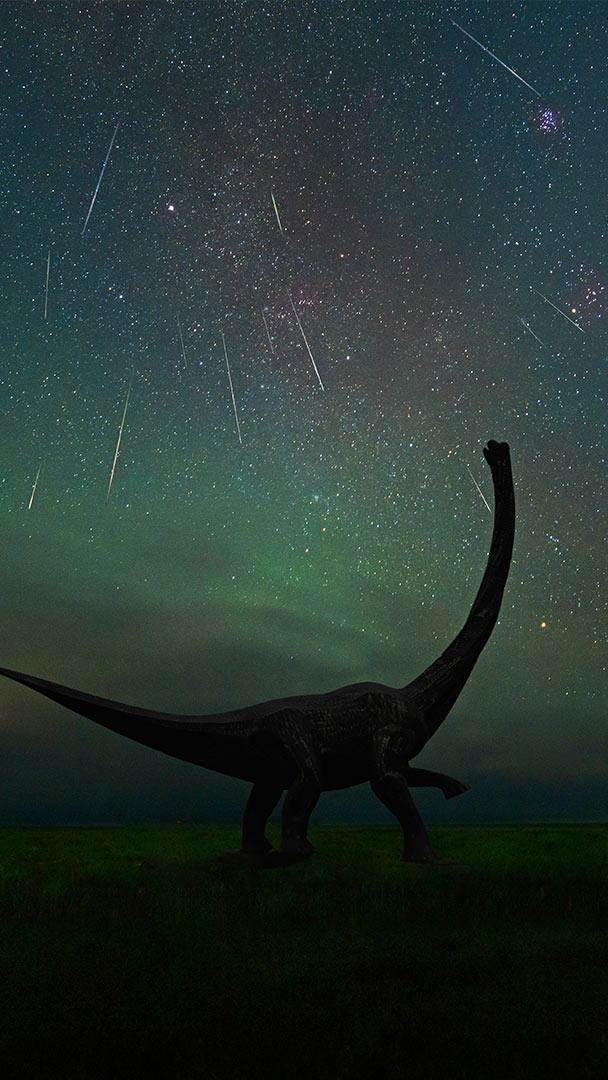 拍摄于二连浩特恐龙博物馆中的英仙座流星雨,中国内蒙古