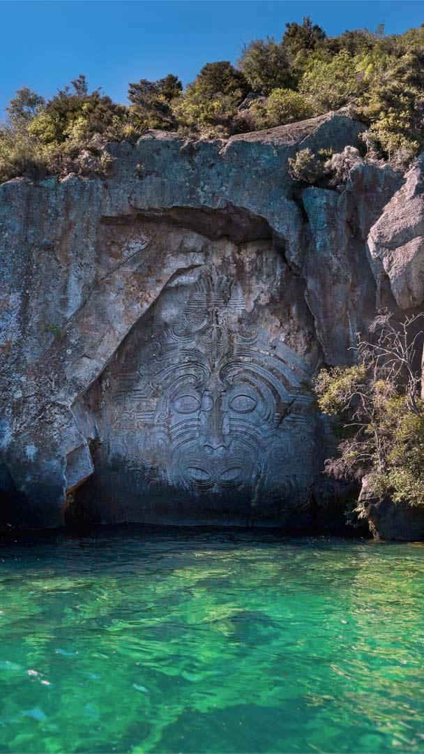 雕刻师在矿山湾创作的岩雕作品,新西兰北岛陶波湖
