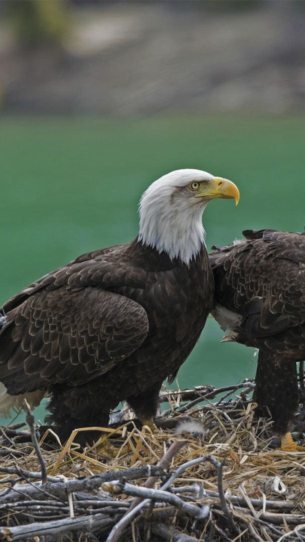 育空河附近巢穴中的一对白头海雕和雏鹰,加拿大育空