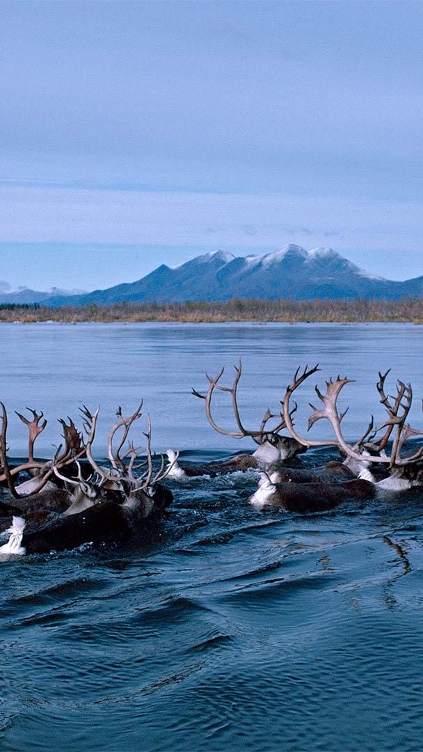 秋季迁徙时正在游过科伯克河的驯鹿,阿拉斯加