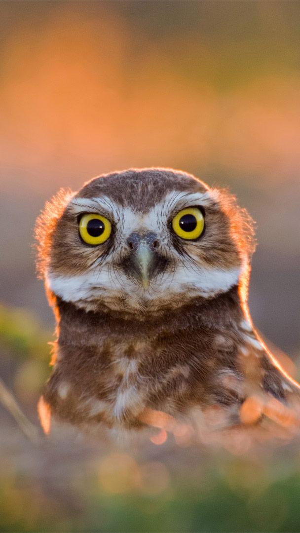 一只成年的穴居猫头鹰在日落时从洞穴中钻出来,加利福尼亚戴维斯