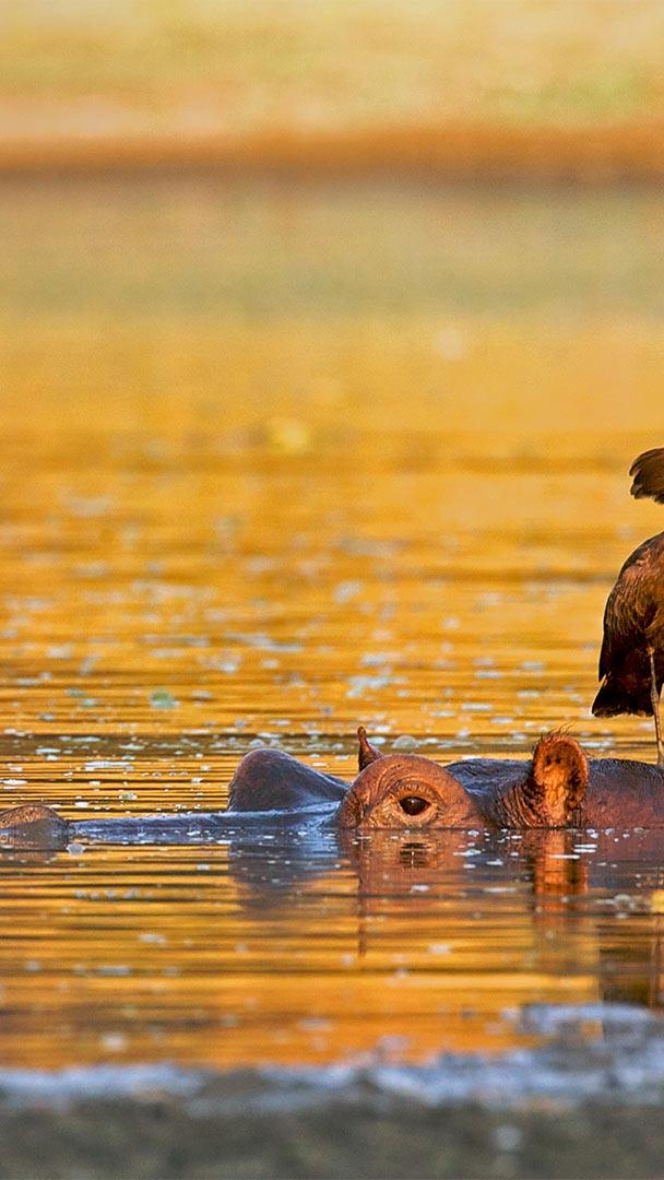 站在河马身上的锤头鹳,津巴布韦马纳潭国家公园
