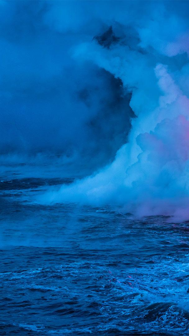 一艘游船经过时熔岩流撞击水面产生爆炸,夏威夷火山国家公园