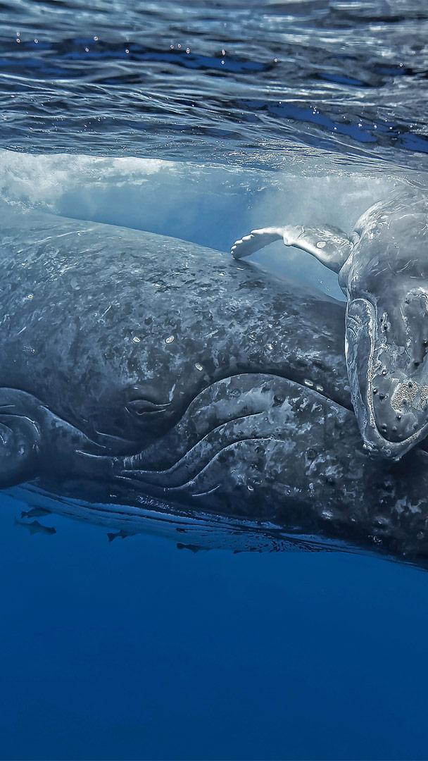 汤加海岸正要拥抱妈妈的小座头鲸