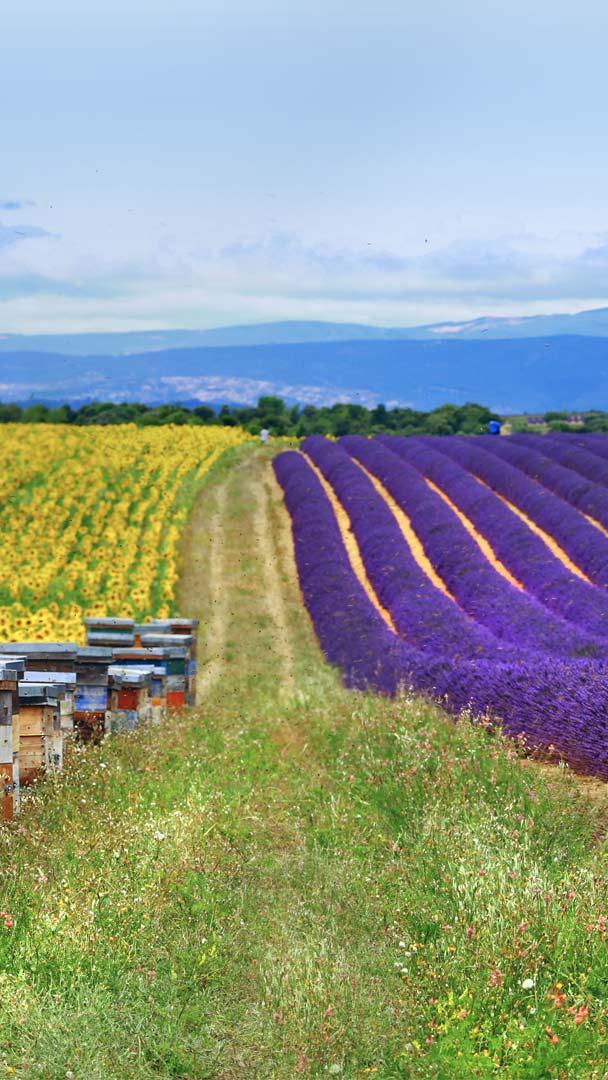 薰衣草田和蜂箱旁的向日葵地,法国普罗旺斯