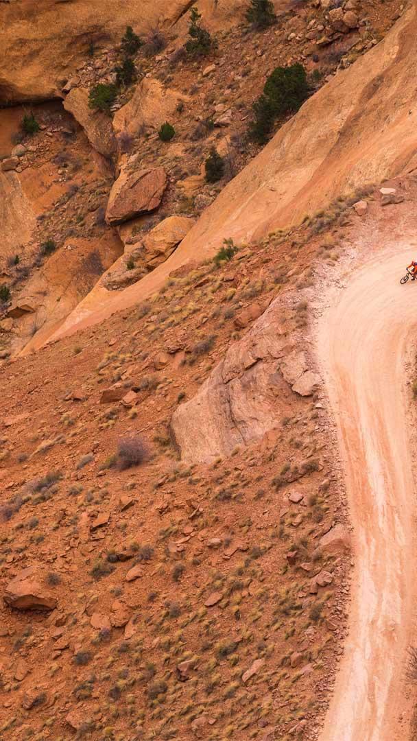 两名山地车骑手在白缘公路上沿着谢福小道的转弯处骑行 ,犹他州峡谷地国家公园