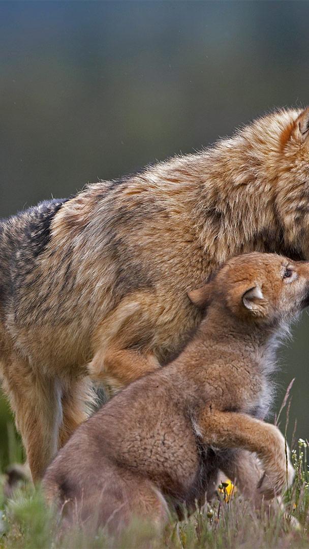 同乞食的小狗在一起的灰狼,蒙大拿州
