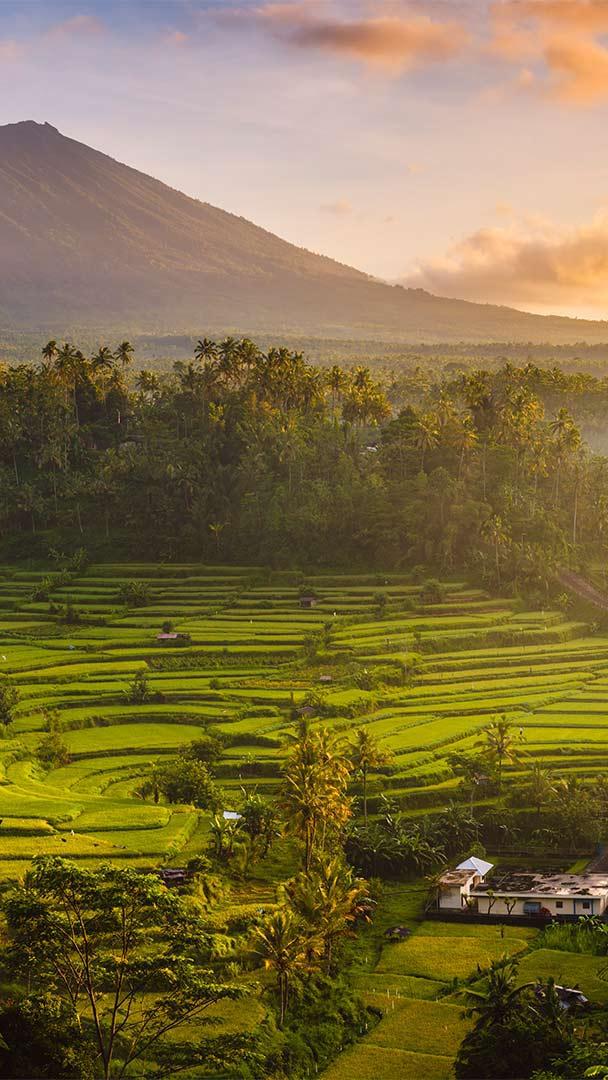 以阿贡火山为背景Sidemen山谷中的稻田,印度尼西亚巴厘岛