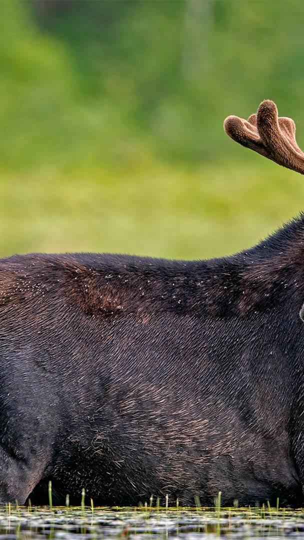 一只正在吃着百合花的驼鹿,缅因州米利诺基特