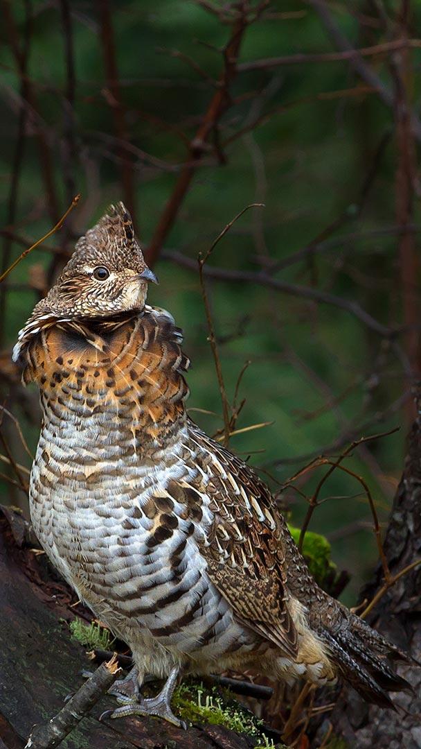 阿尔冈金省立公园中一只正在树枝上休息的披肩鸡 ,加拿大安大略省