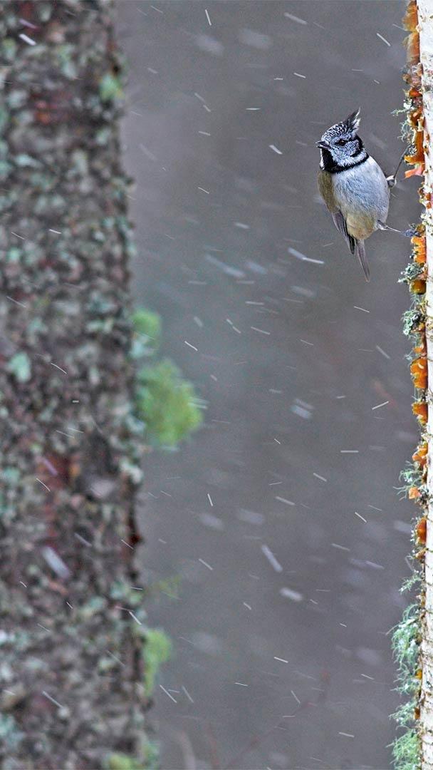 一只经受暴风雨的冠山雀,苏格兰