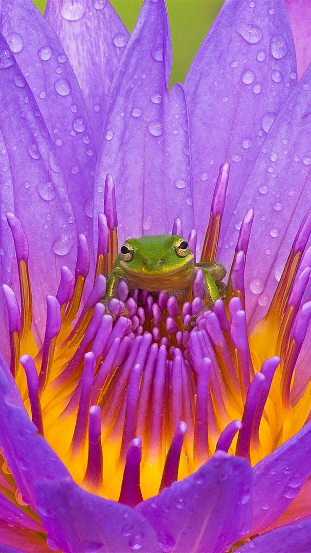 基西米湖中的绿色树蛙和紫色睡莲,佛罗里达州