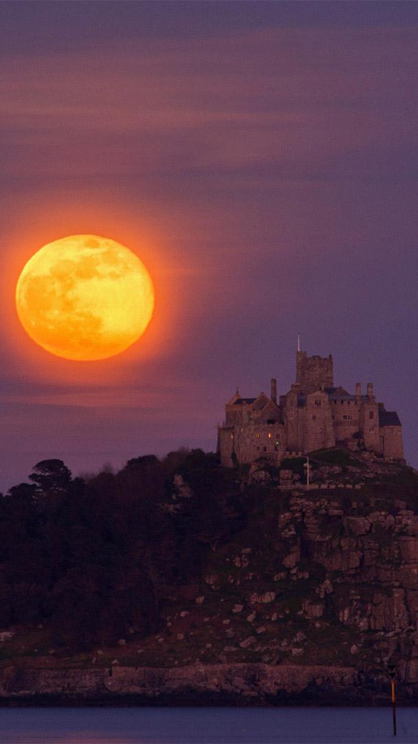 四月的满月从圣迈克尔山上升起,英国康沃尔