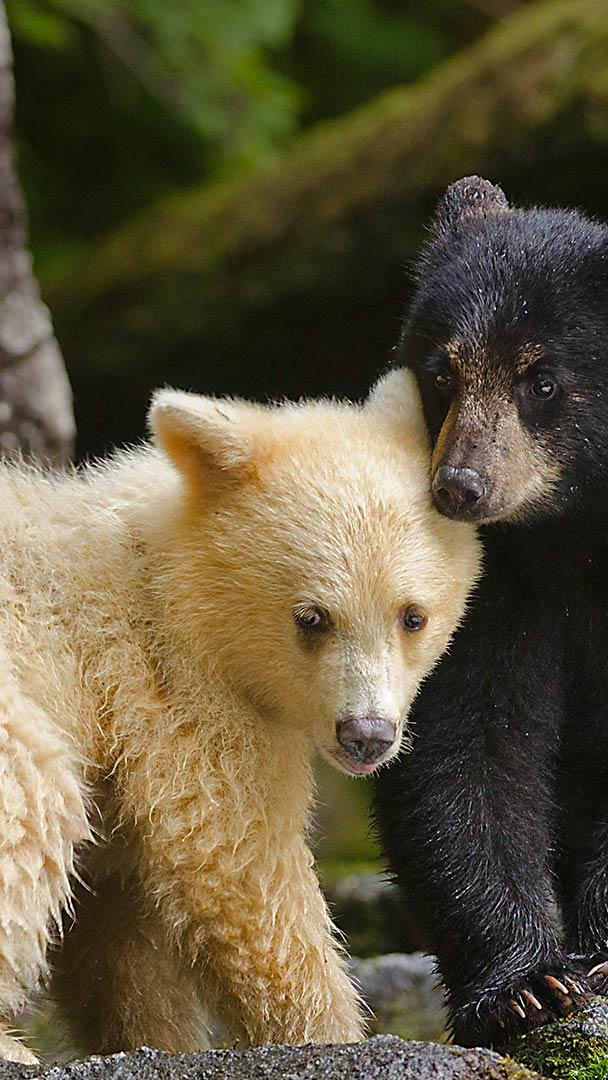 大熊雨林中一只柯莫德熊幼崽跟它的同胞挤在一起,加拿大