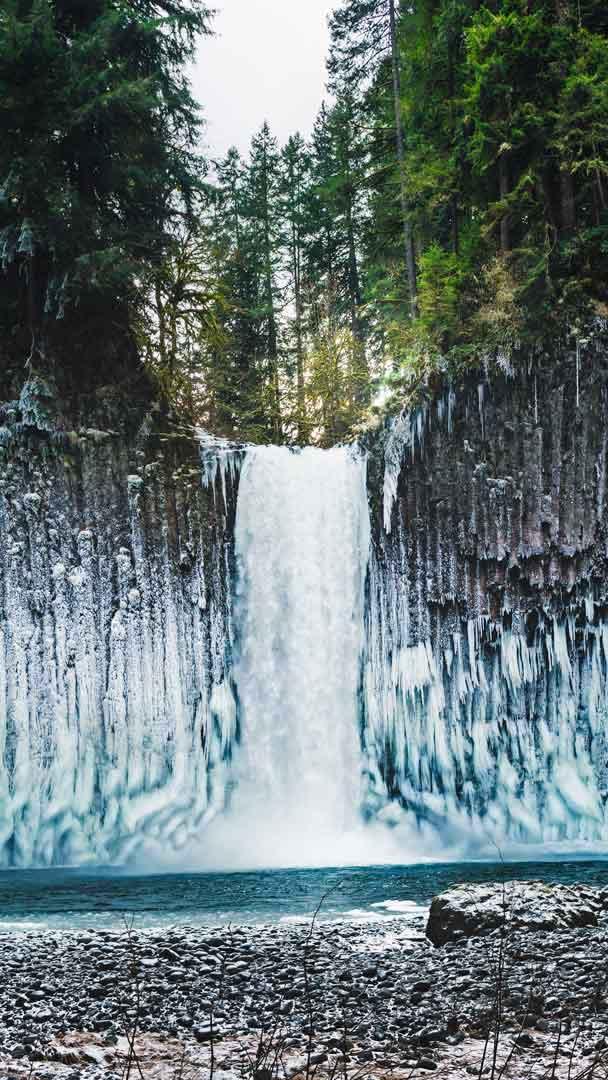 巨大的冰柱悬挂在Abiqua瀑布周围的玄武岩石墙上,俄勒冈