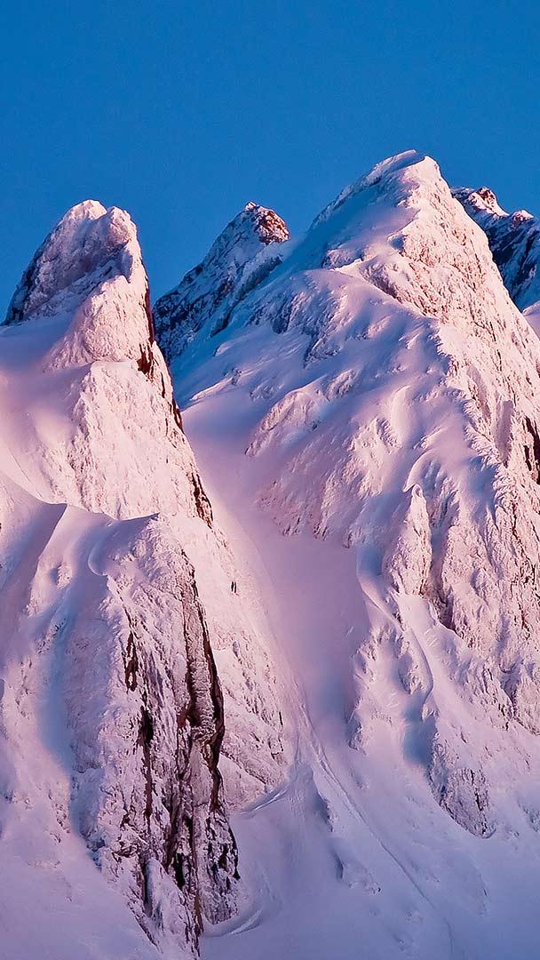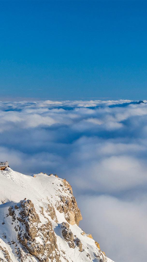 以佩尔莫山为背景云层之上的Rifugio Lagazuoi,意大利多洛米蒂山脉