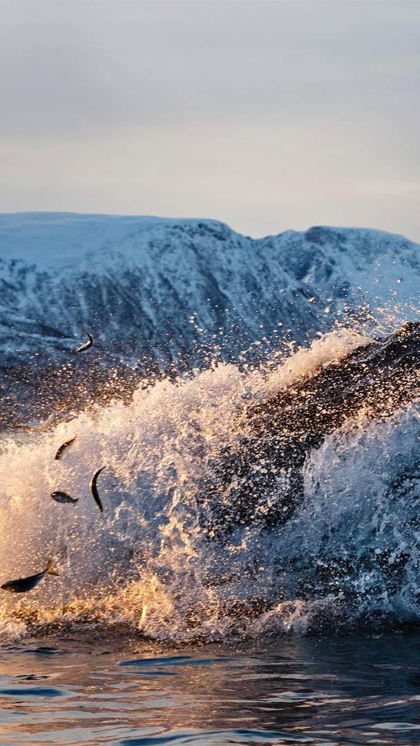 克瓦尔岛海岸以鲱鱼为食的座头鲸,北挪威特罗姆瑟