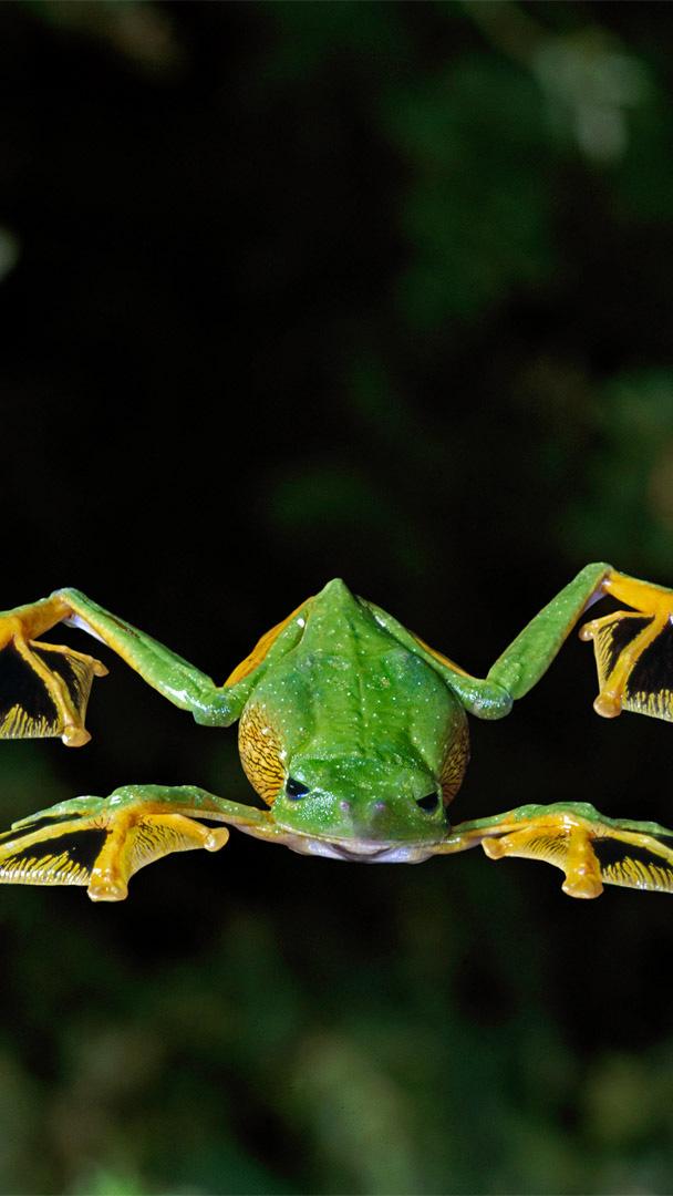 一只华莱士飞蛙掠过森林地面