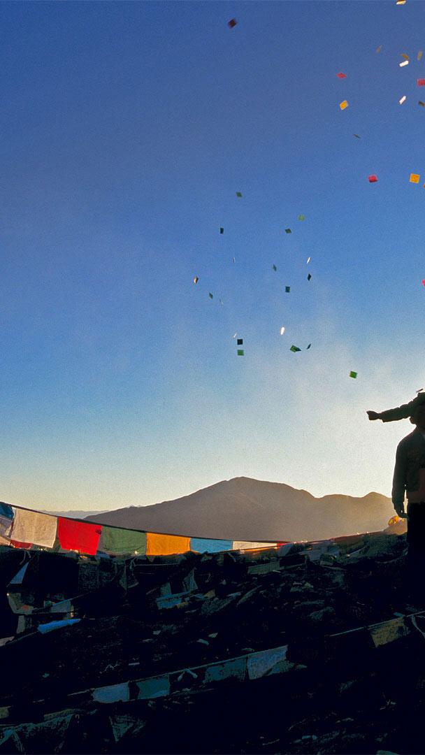朝圣者将风马旗扔向甘登寺上方的空中为新年祈福,中国西藏