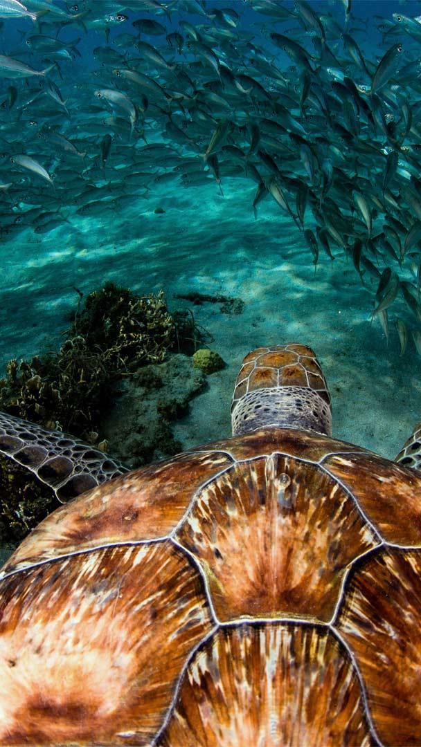 库拉索普拉亚格兰迪海滩附近的绿海龟和沙丁鱼