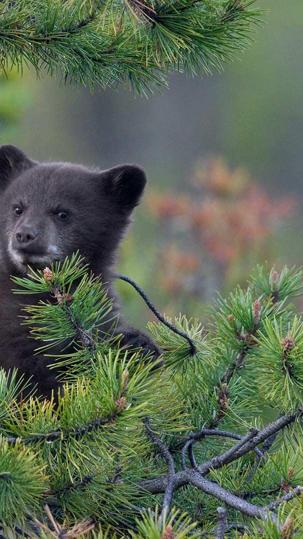 松树上的一只美国黑熊幼崽,加拿大贾斯珀国家公园