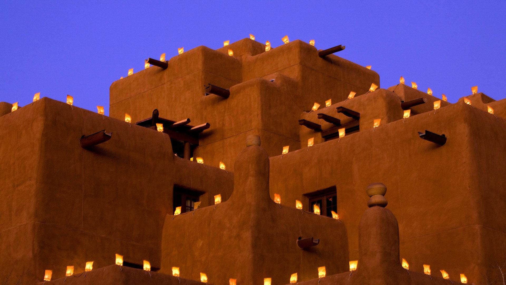 被纸袋灯照亮的酒店,洛雷托,圣达菲,新墨西哥州,美国