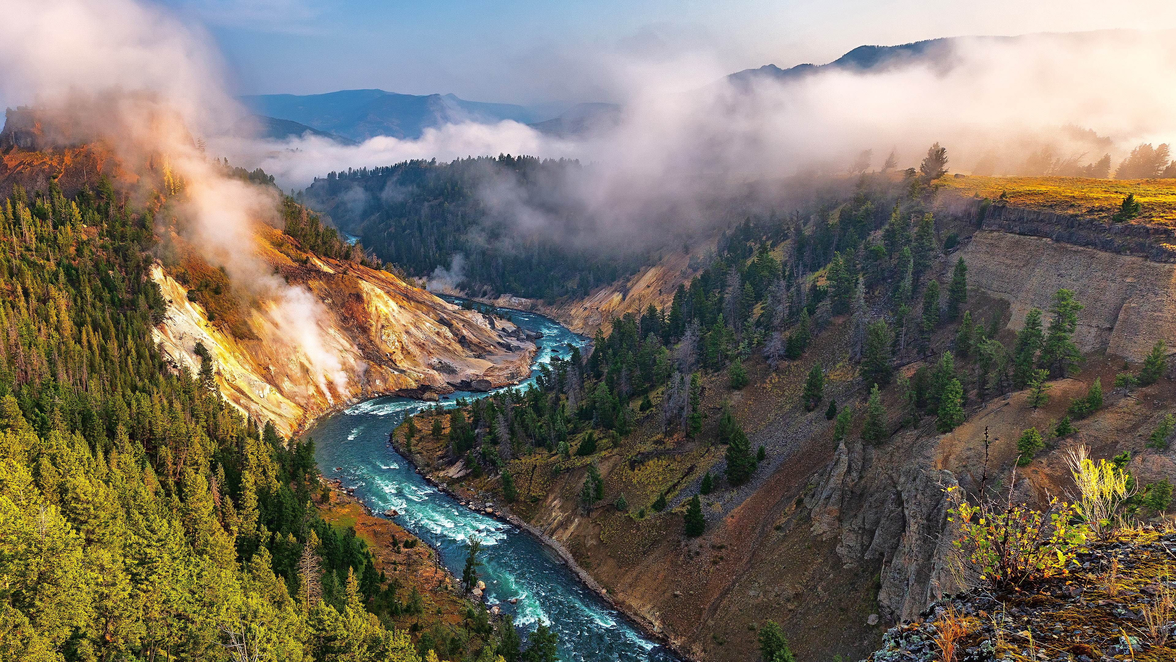 Aussichtspunkt Calcite Springs und Yellowstone River, Yellowstone-Nationalpark, Wyoming, USA © Rebecca L. Latson/Getty Images Naturgewalten im Wandel Aussichtspunkt Calcite Springs und Yellowstone River, Yellowstone-Nationalpark, Wyoming, USA