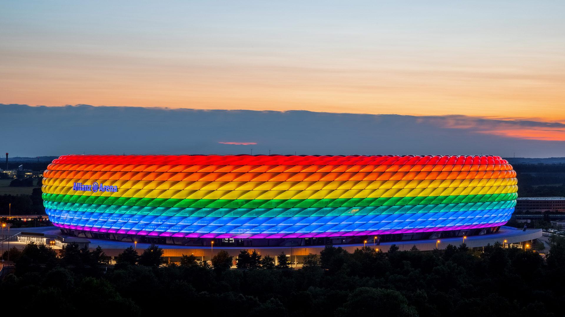Die Allianz Arena in Regenbogenfarben beleuchtet, München, Deutschland © Marci Kost/Getty Images Liebe ist Liebe Die Allianz Arena in Regenbogenfarben beleuchtet, München, Deutschland